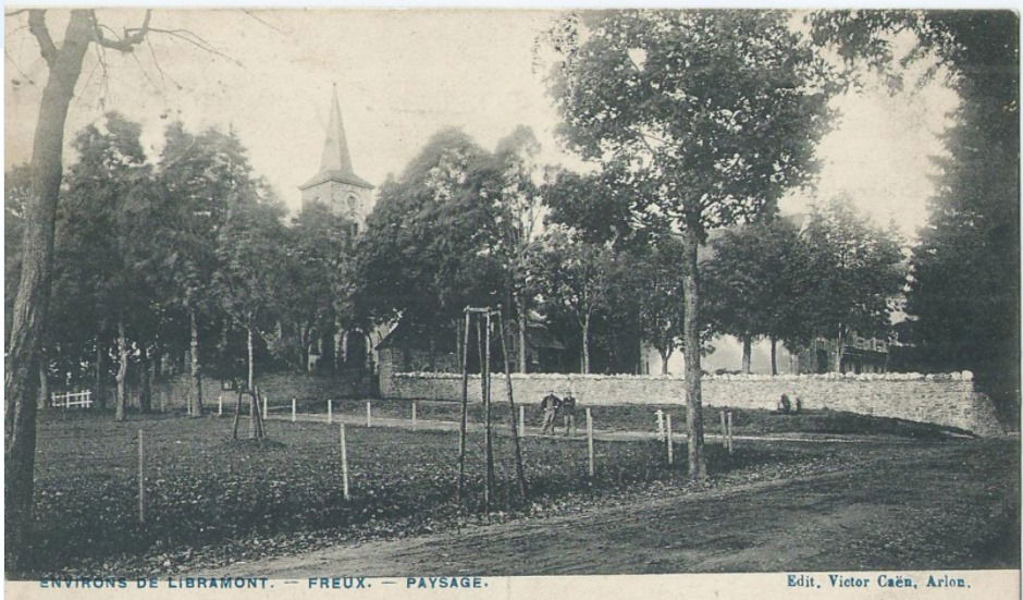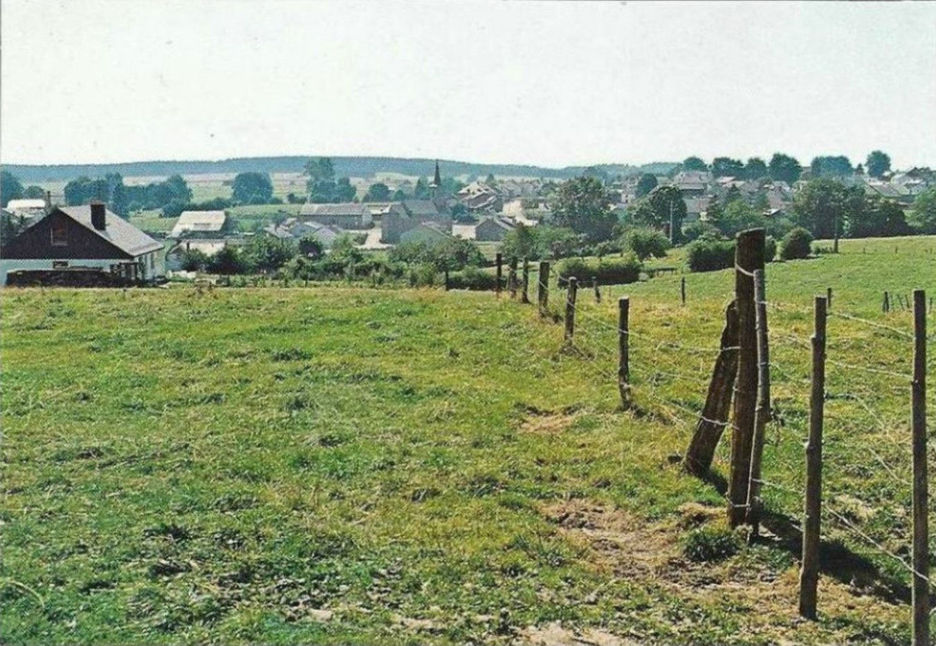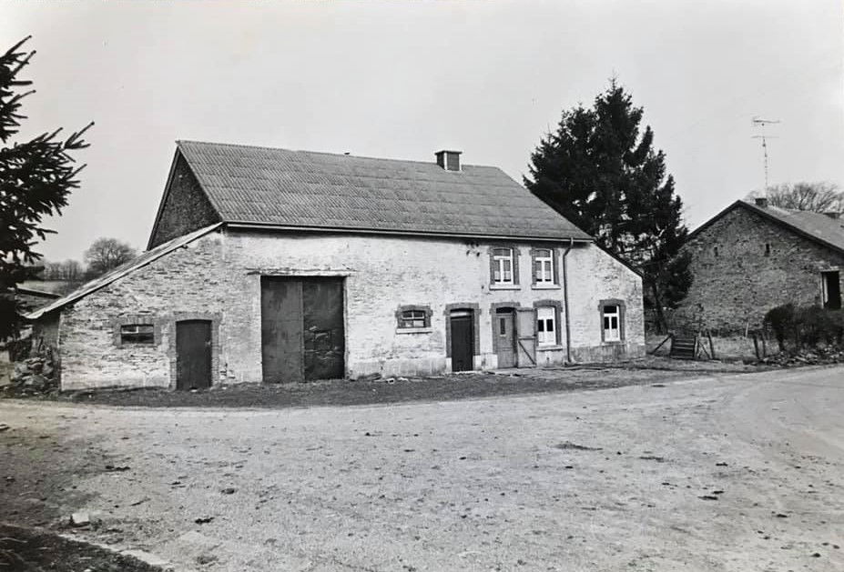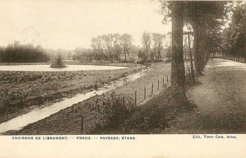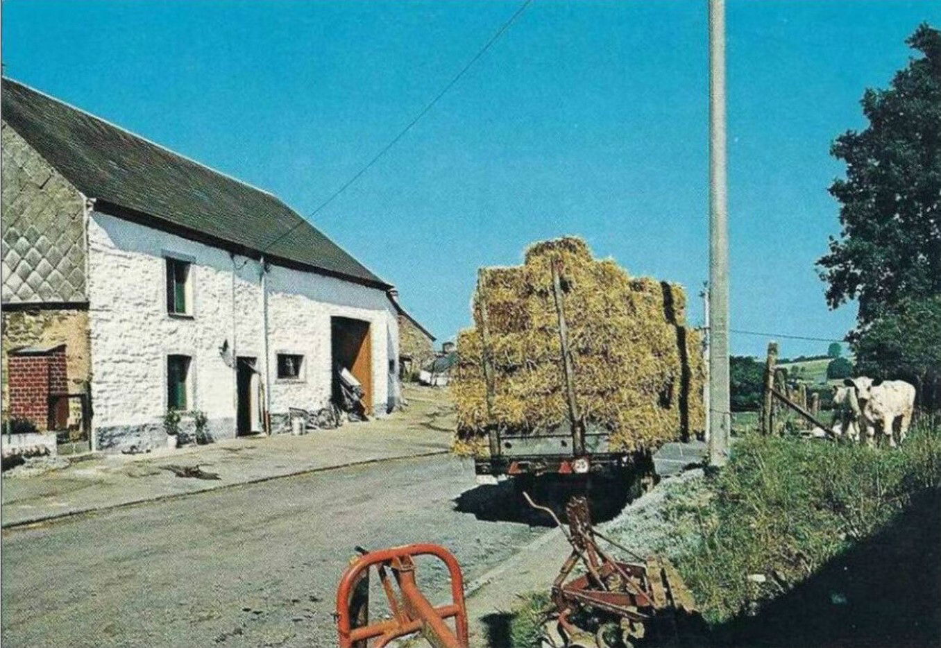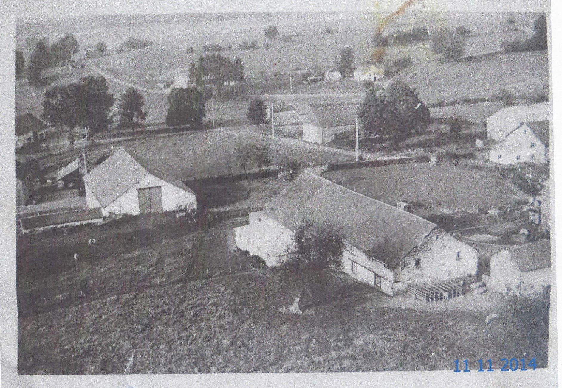 C'est la ferme de Jules Rosiere que l'on aperçoit en 1er Il y avait une "carrière" à l'arrière-plan à gauche. On allait y déverser tout ce qu'on met au parc à containers actuellement C'est la route qui vient de Freux en passant par l'étang de la Grotte. La route qui passe à coté du petit hangar, à gauche, conduit à l'ancienne carrière de Freux, dite carrière de la Hazlette. De là, on descend vers la rue du Moulin à Freux-Menil.