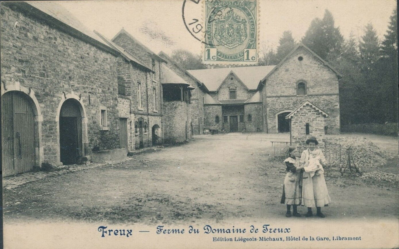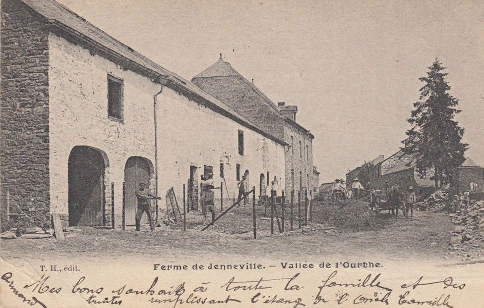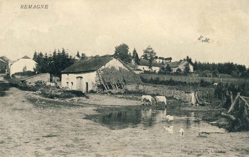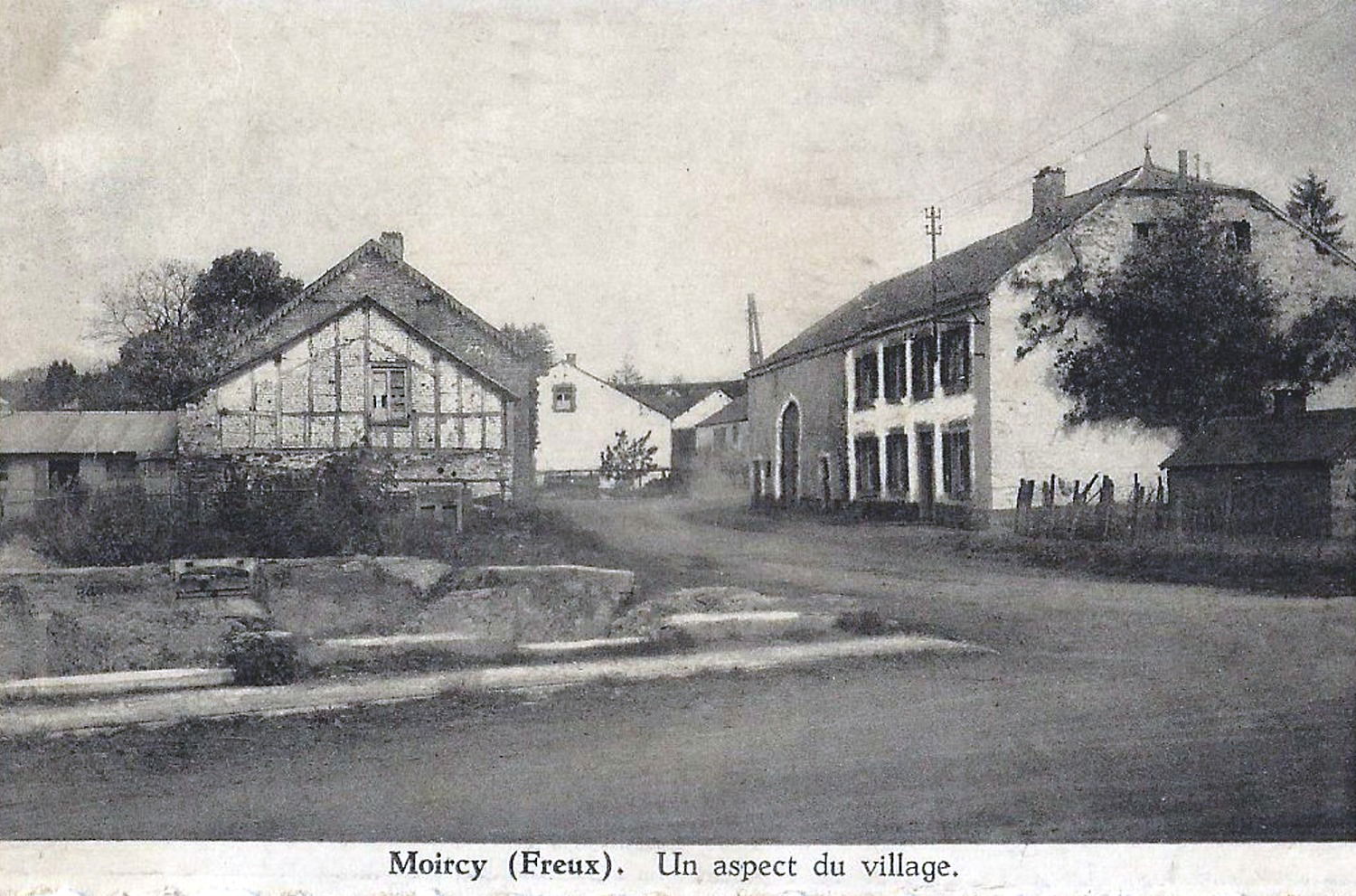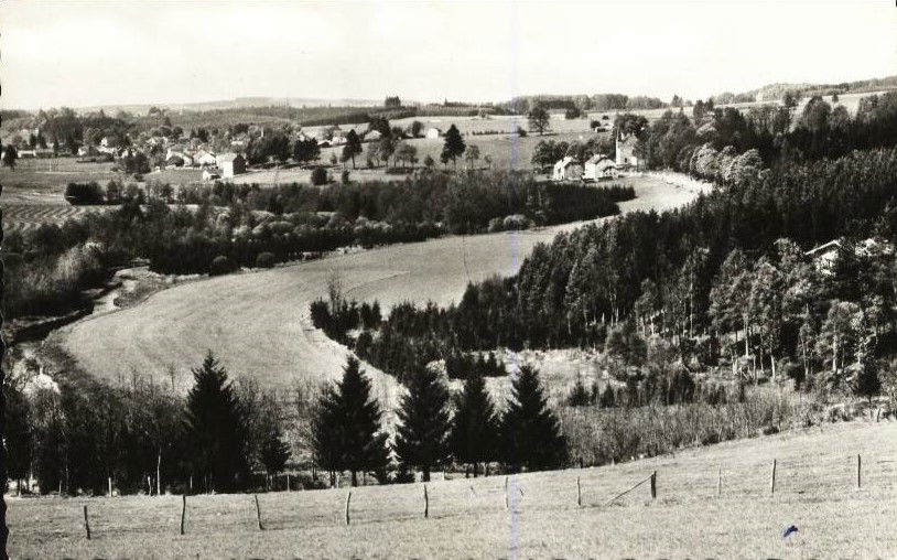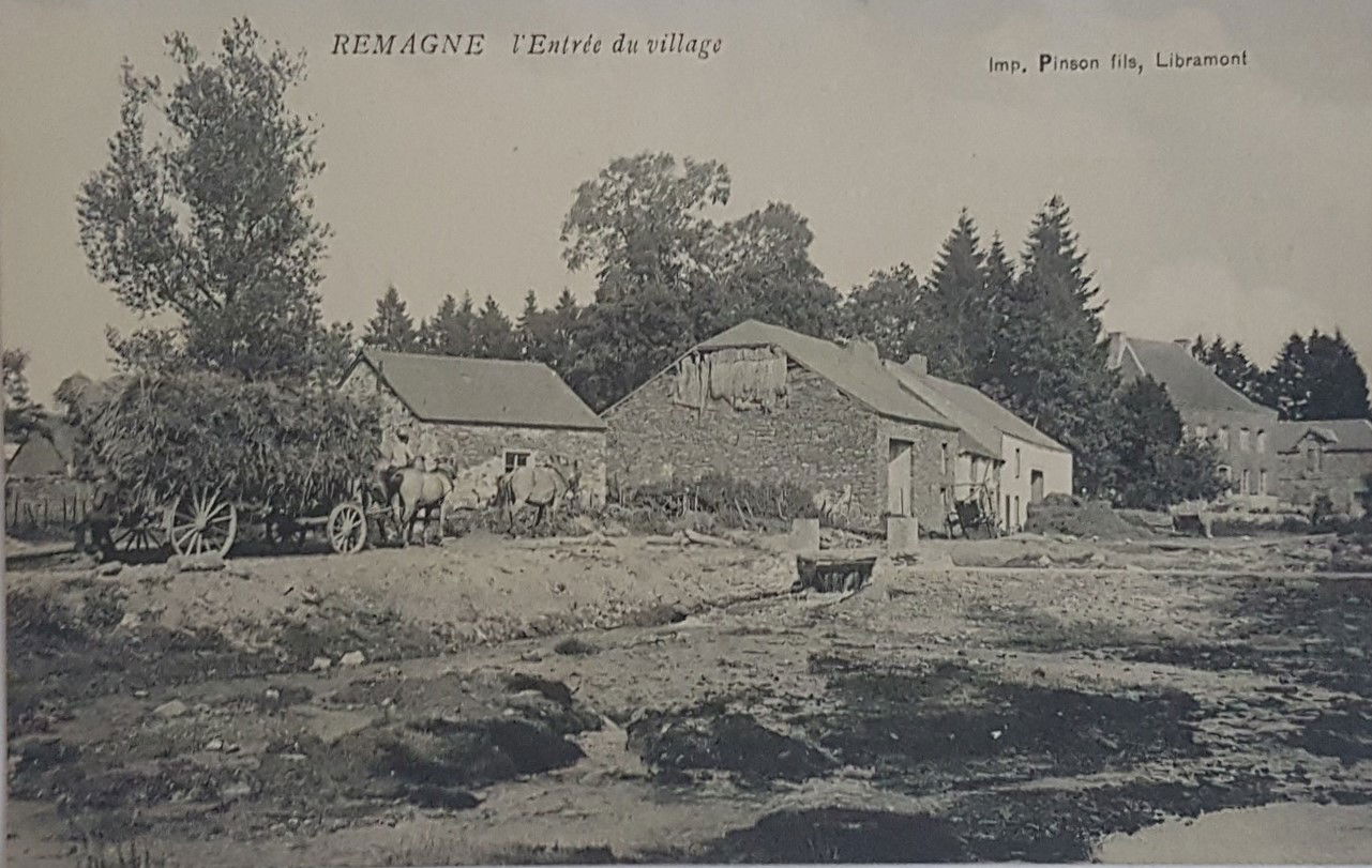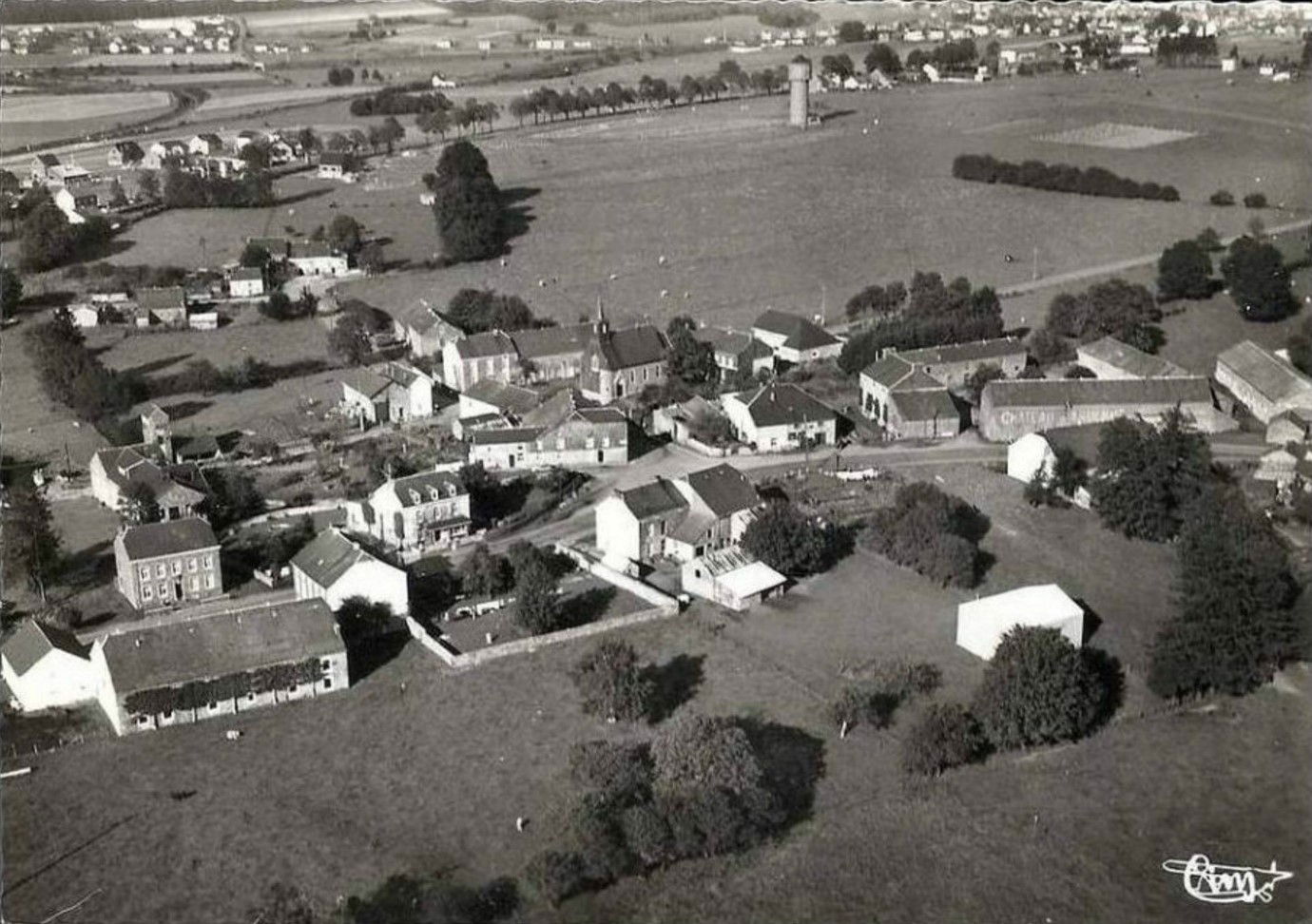 C'est la ferme de Jules Rosiere que l'on aperçoit en 1er Il y avait une "carrière" à l'arrière-plan à gauche. On allait y déverser tout ce qu'on met au parc à containers actuellement C'est la route qui vient de Freux en passant par l'étang de la Grotte. La route qui passe à coté du petit hangar, à gauche, conduit à l'ancienne carrière de Freux, dite carrière de la Hazlette. De là, on descend vers la rue du Moulin à Freux-Menil.
