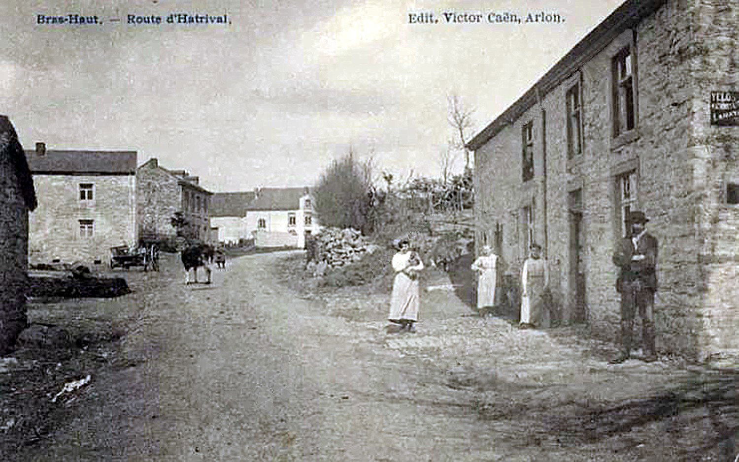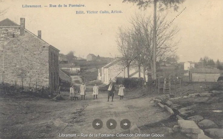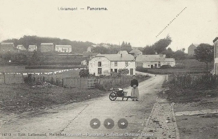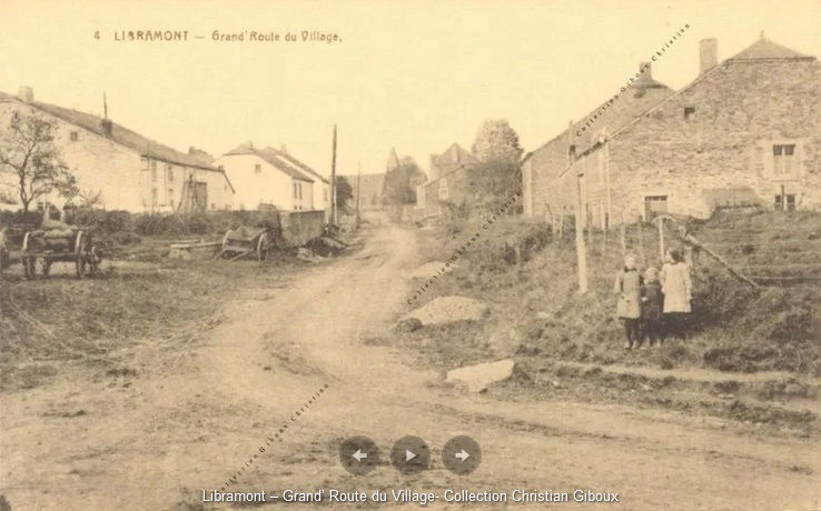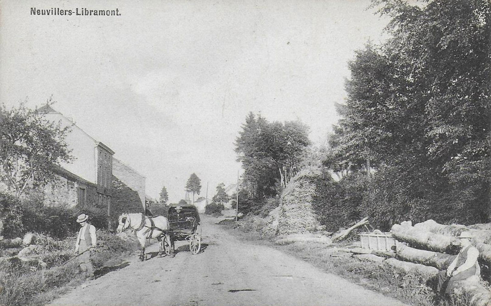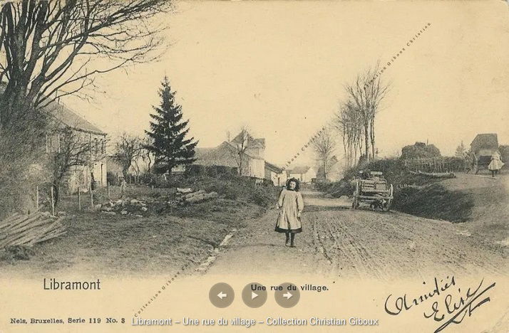 1909 La rue du Village, berceau de Libramont, en direction du pont. Dans le fond, on aperçoit les premières maisons de la rue des Alliées ( Anciennement la rue des Allemands ) Au milieu de la route, la dame conduisant la brouette à linge, se dirige vers ou revient de la fontaine.