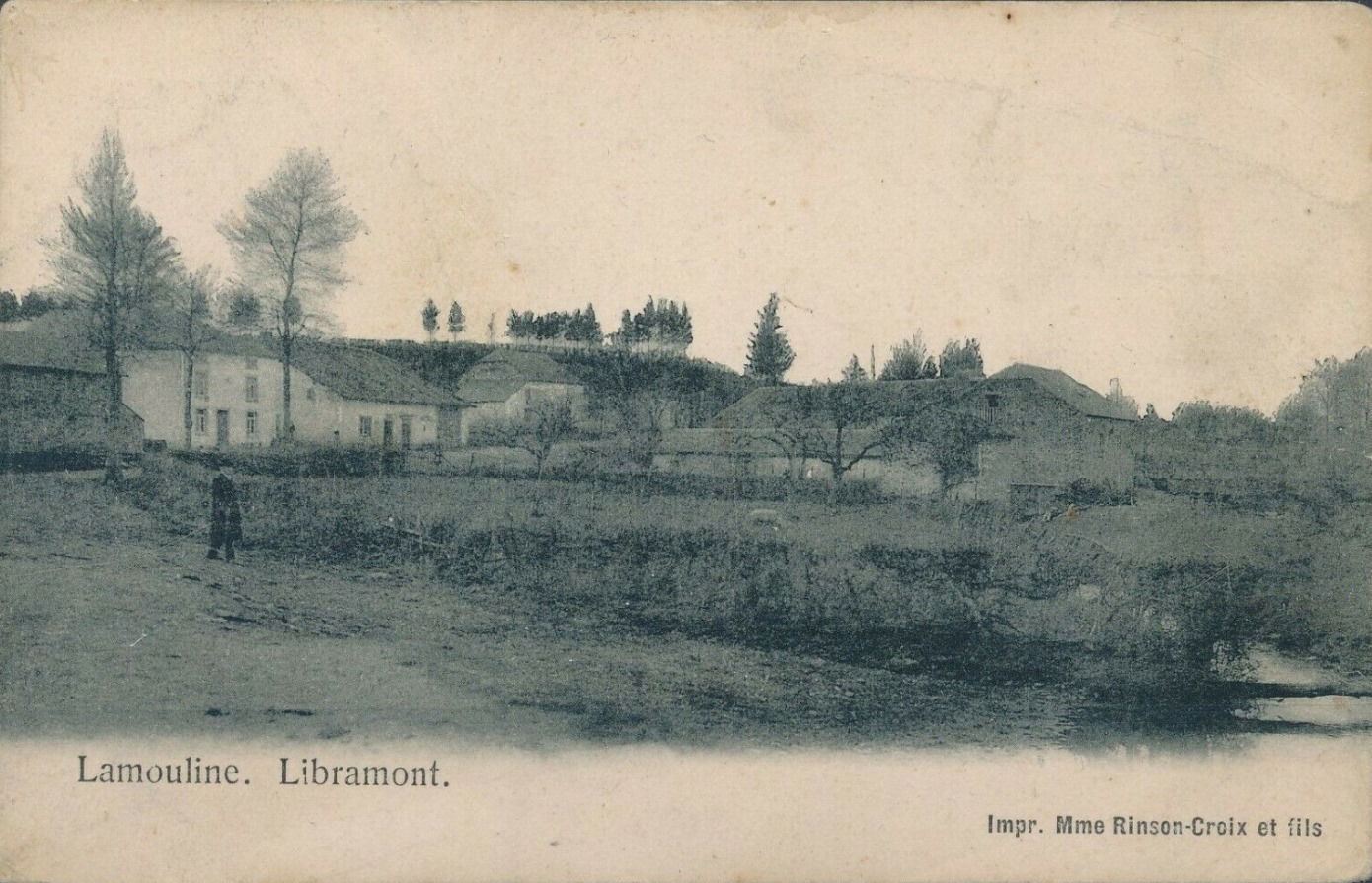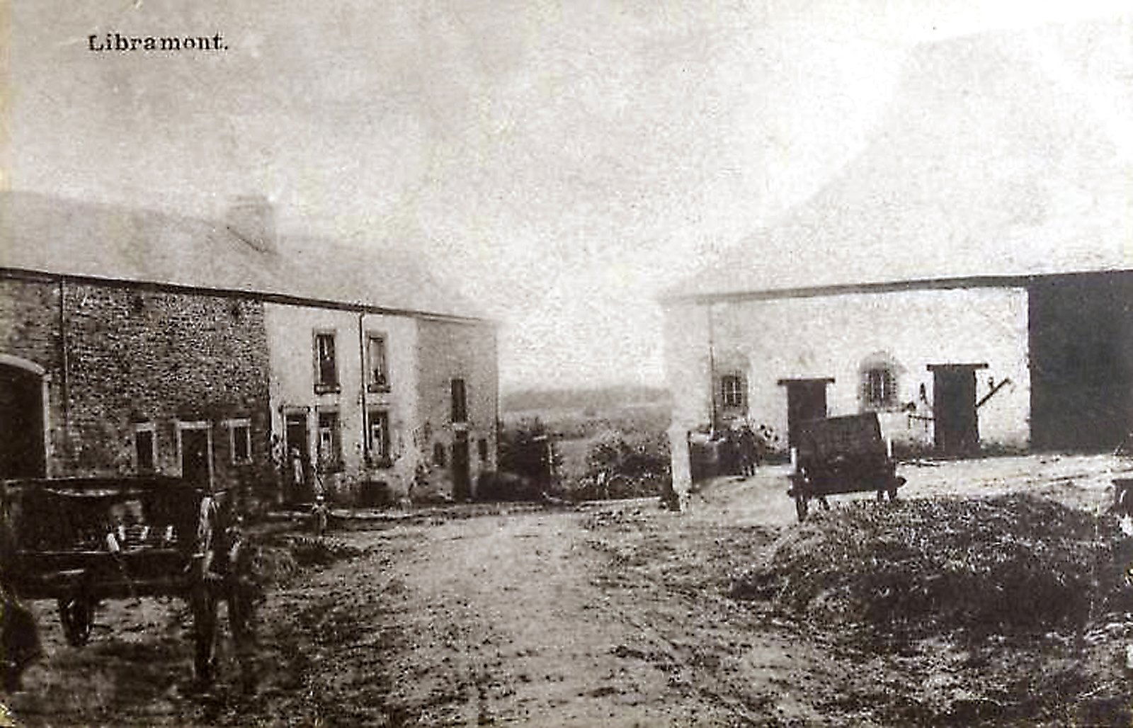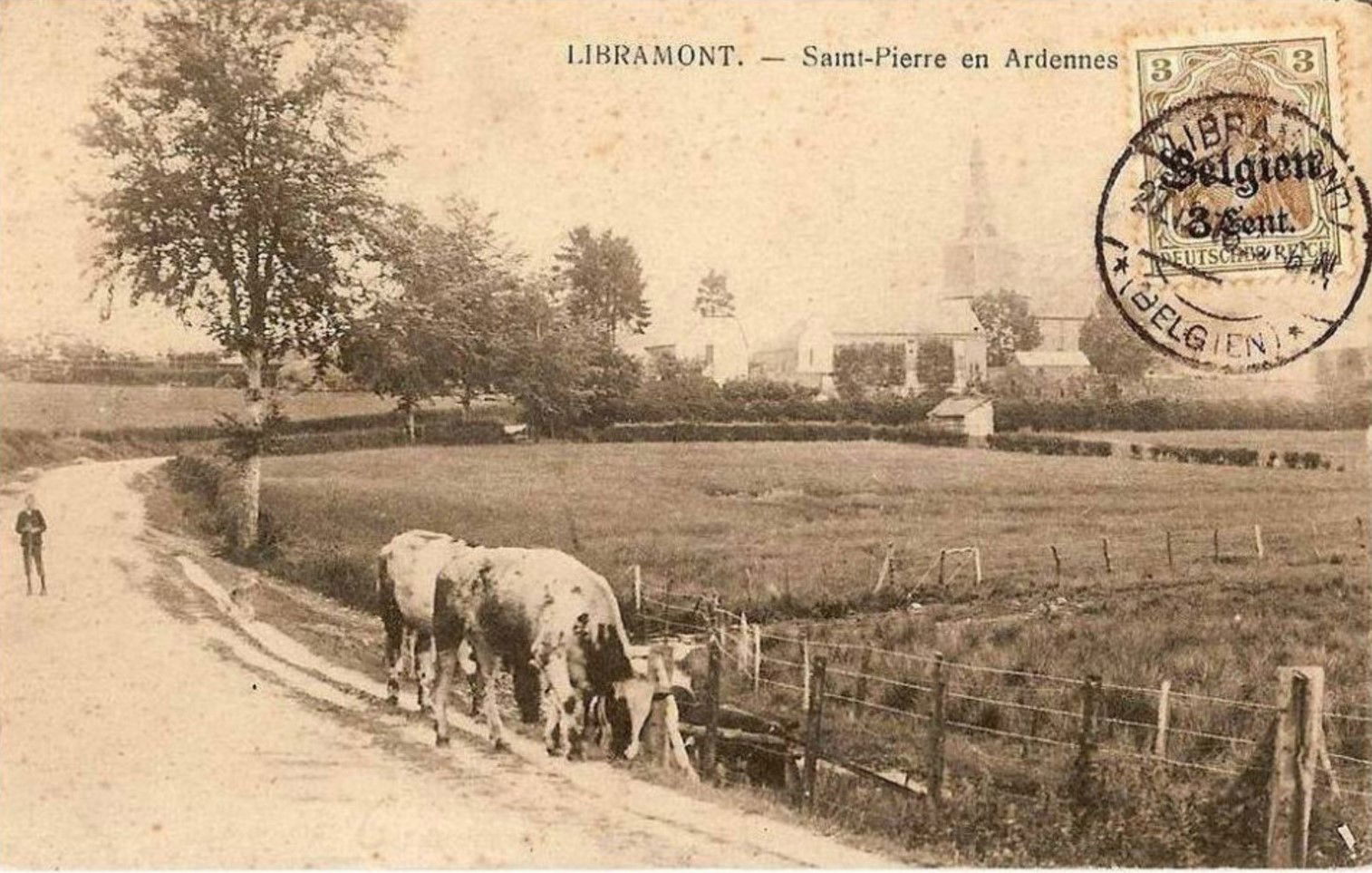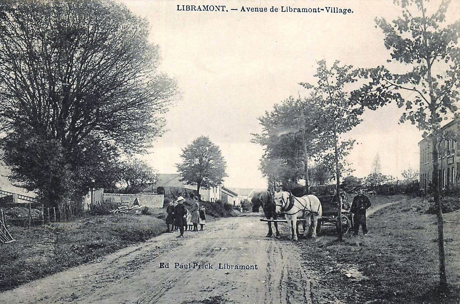 1909 La rue du Village, berceau de Libramont, en direction du pont. Dans le fond, on aperçoit les premières maisons de la rue des Alliées ( Anciennement la rue des Allemands ) Au milieu de la route, la dame conduisant la brouette à linge, se dirige vers ou revient de la fontaine.