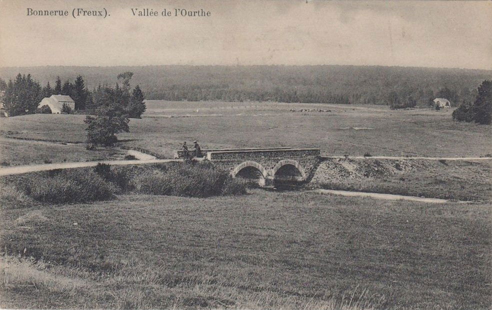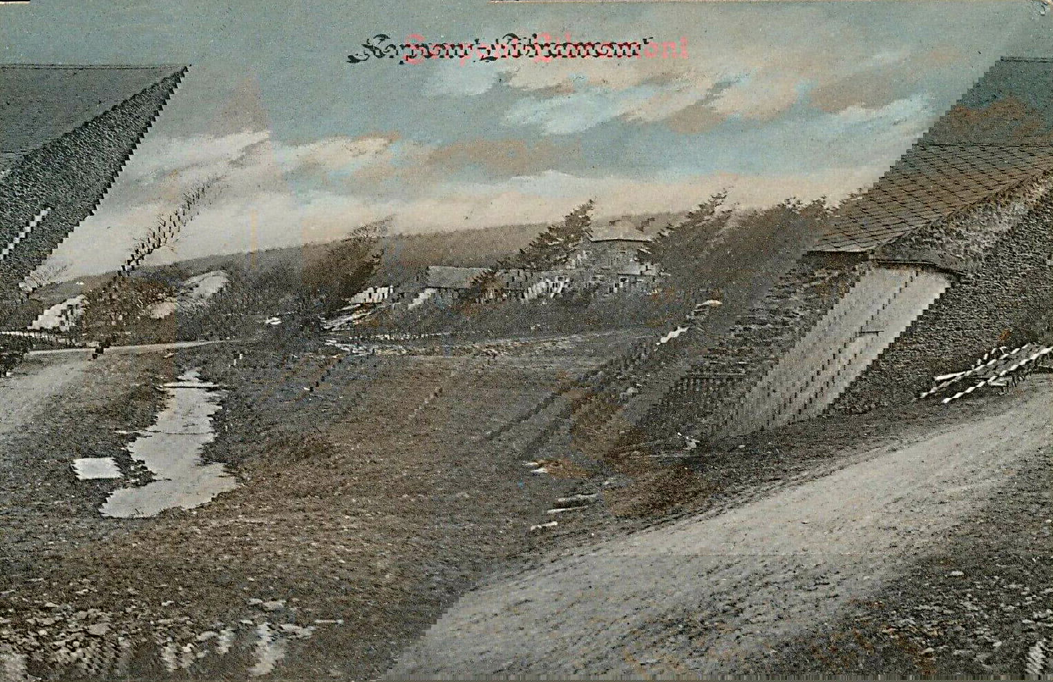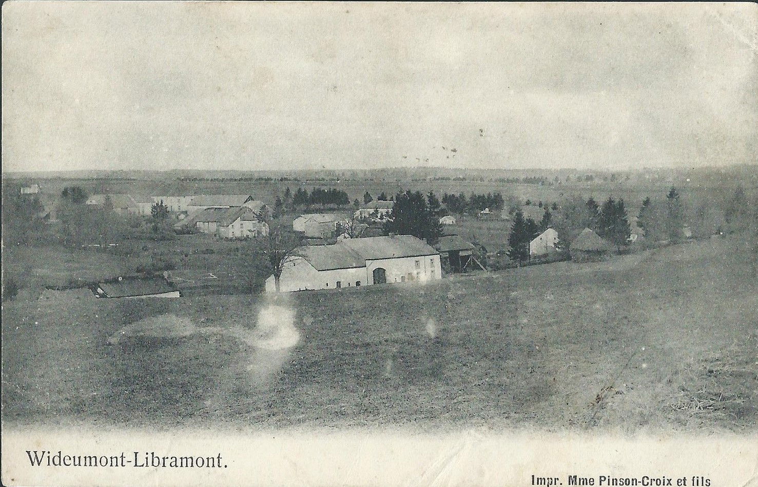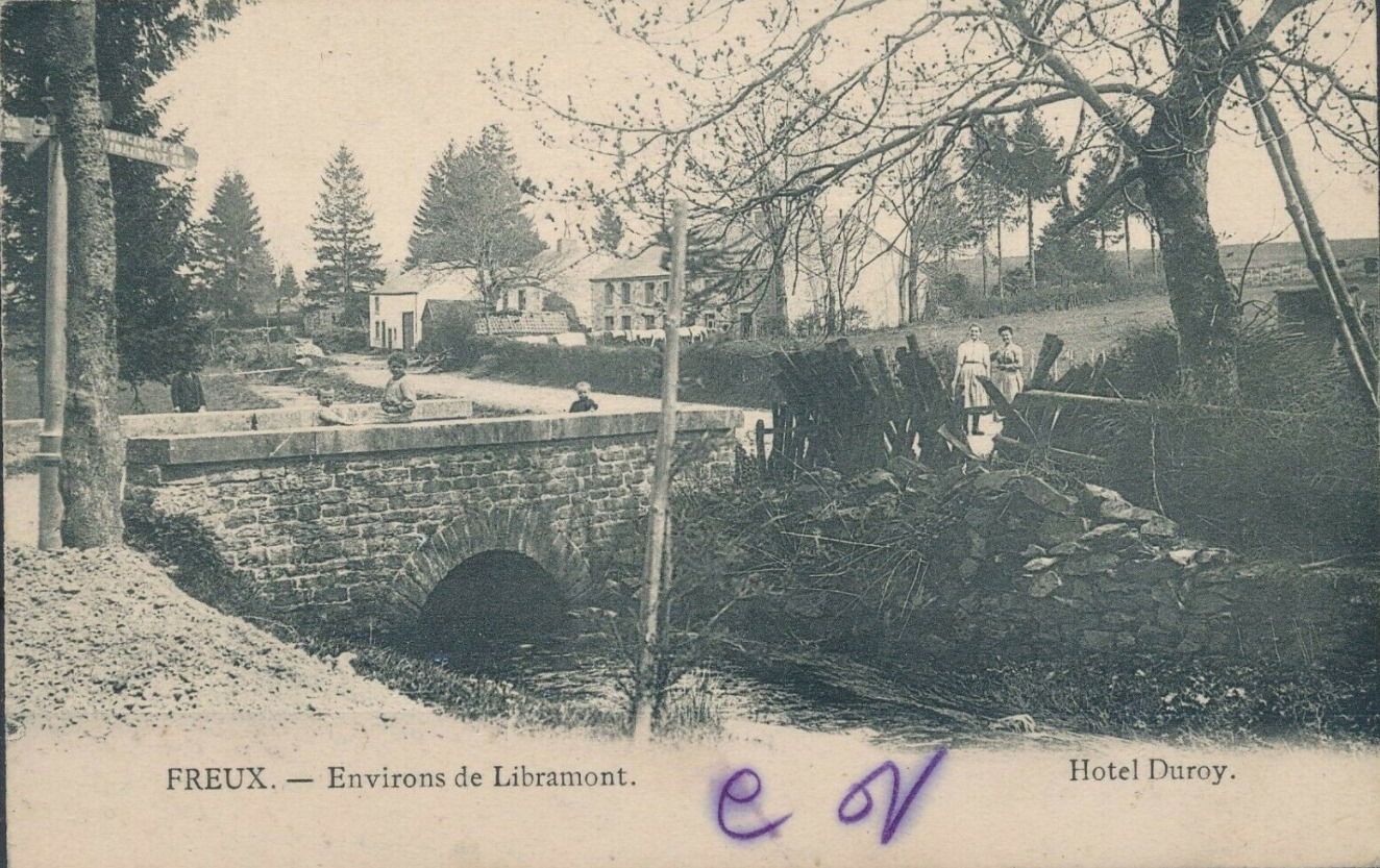 1909 La rue du Village, berceau de Libramont, en direction du pont. Dans le fond, on aperçoit les premières maisons de la rue des Alliées ( Anciennement la rue des Allemands ) Au milieu de la route, la dame conduisant la brouette à linge, se dirige vers ou revient de la fontaine.