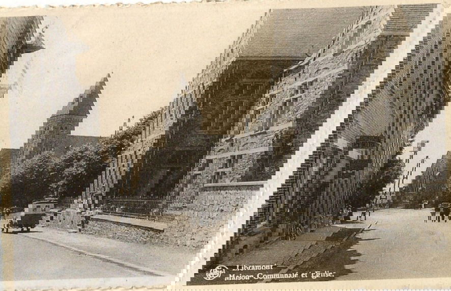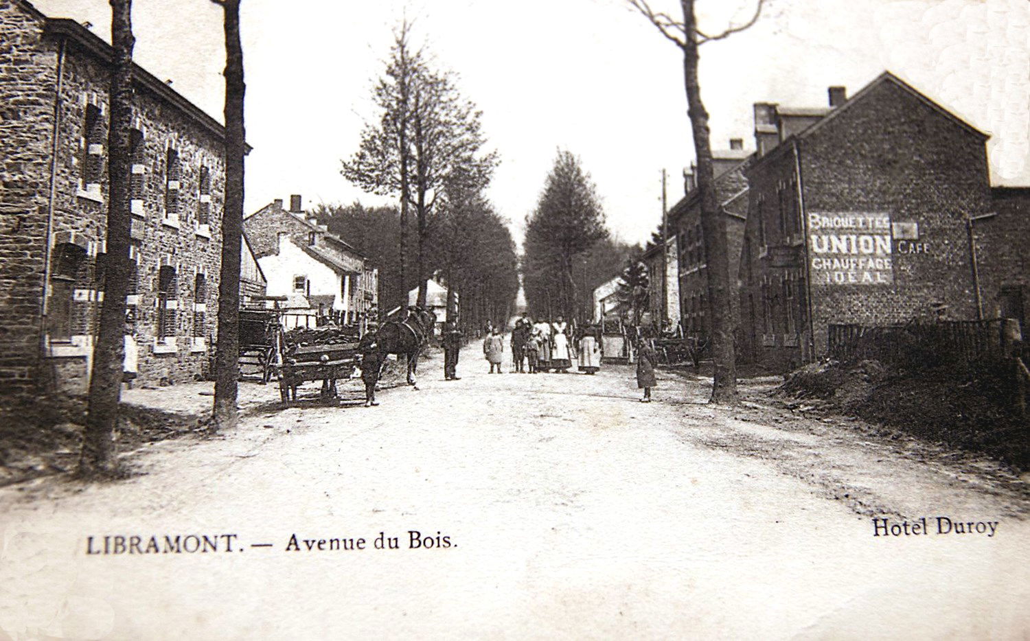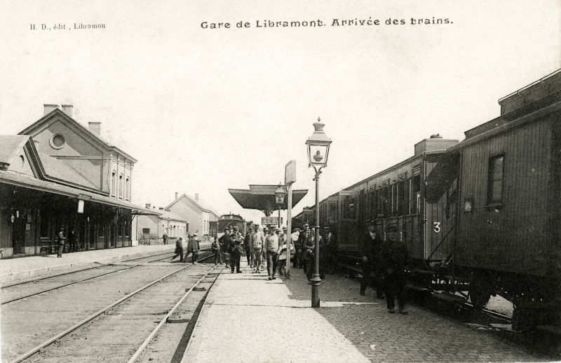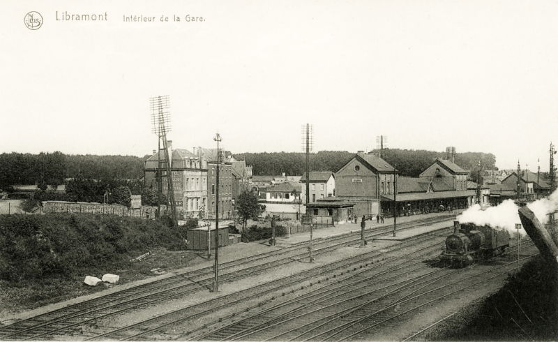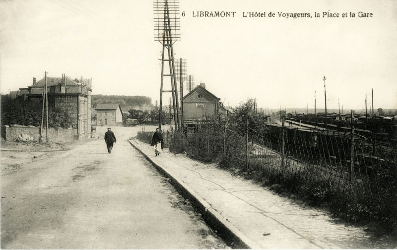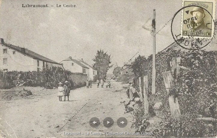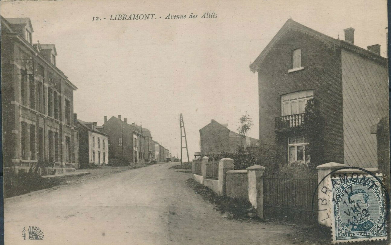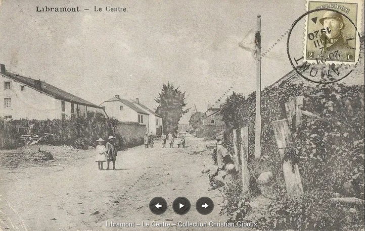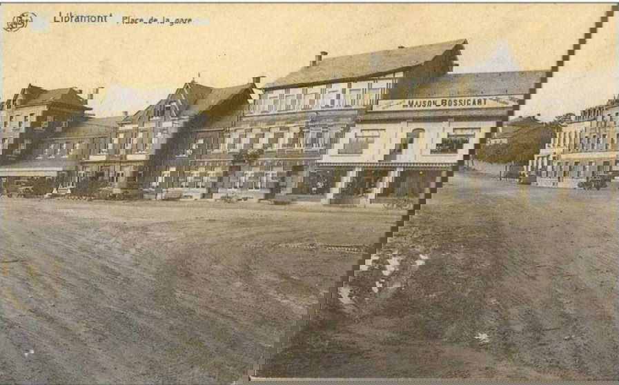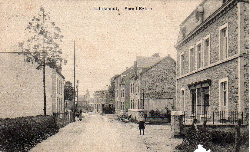 Début de la grand rue en direction de la Place Communale, la tranchée du chemin de fer est dans le dos du photographe.. Si je me souviens de mes études du Libramonissime, les premiers bâtiments à gauche ont été abattus lors de l’élargissement du chemin de fer. Le 4e bâtiment c’est le café anciennement Au Bon Accueil, aujourd’hui Diamond’s Bar. Tout au fond, ce qui deviendra la boucherie Papier et l'ancien Nopri