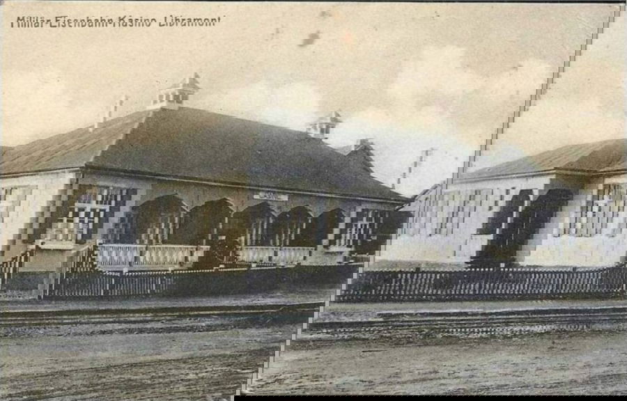 1916 - Mess Militaire du Chemin de Fer et non un "casino" P'tite explication par Bernard Blaise: Attention au terme Kasino en allemand : dans ce contexte, il faut prendre le traduire comme "mess" (établissement ou salle où les officiers et sous-officiers d'un régiment, d'une garnison, prennent leurs repas) et non pas comme un lieu où l'on joue à la roulette. Kasino construit par les allemands. Il se trouvait derrière la place de la gare, entre RTT et la Poste. Il devait y avoir une petite garnison spécialisée dans le domaine du chemin de fer. Il existe des photos montrant des photos de soldats allemands devant la gare.