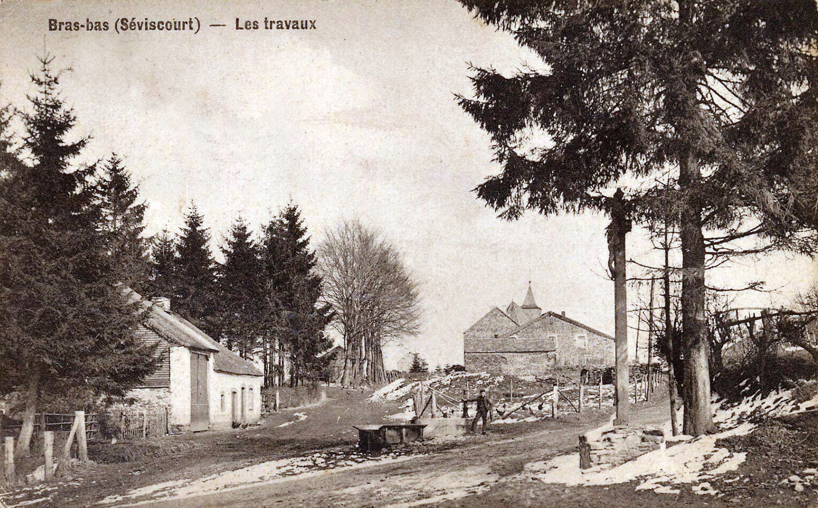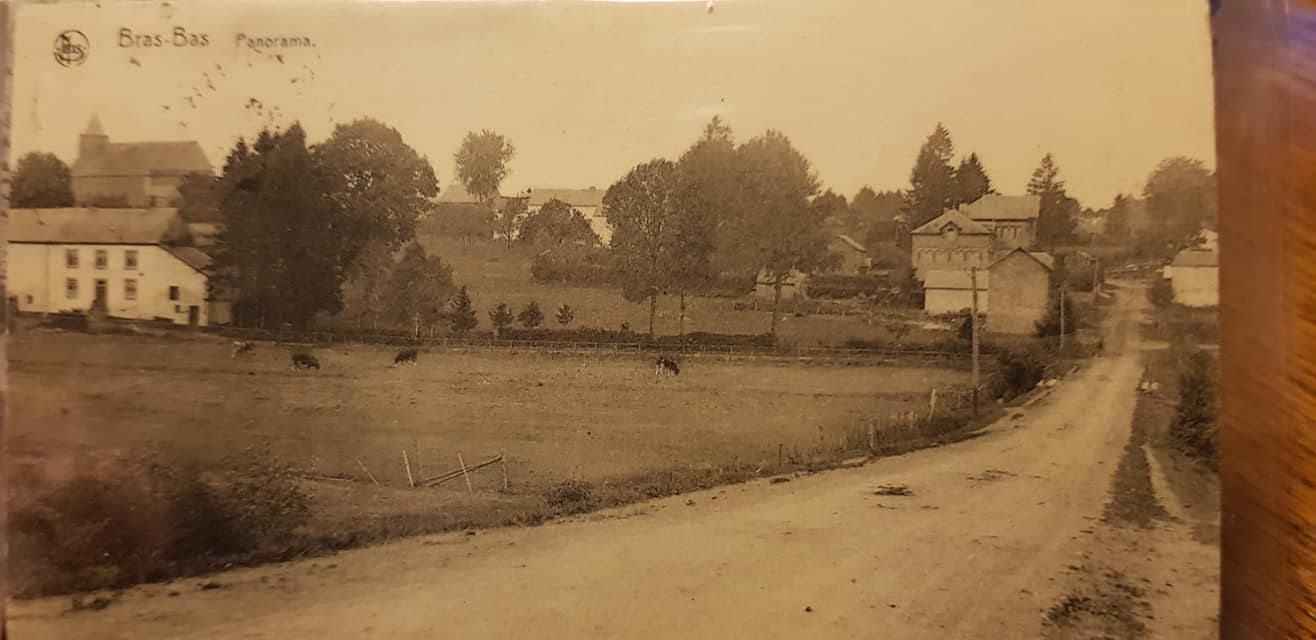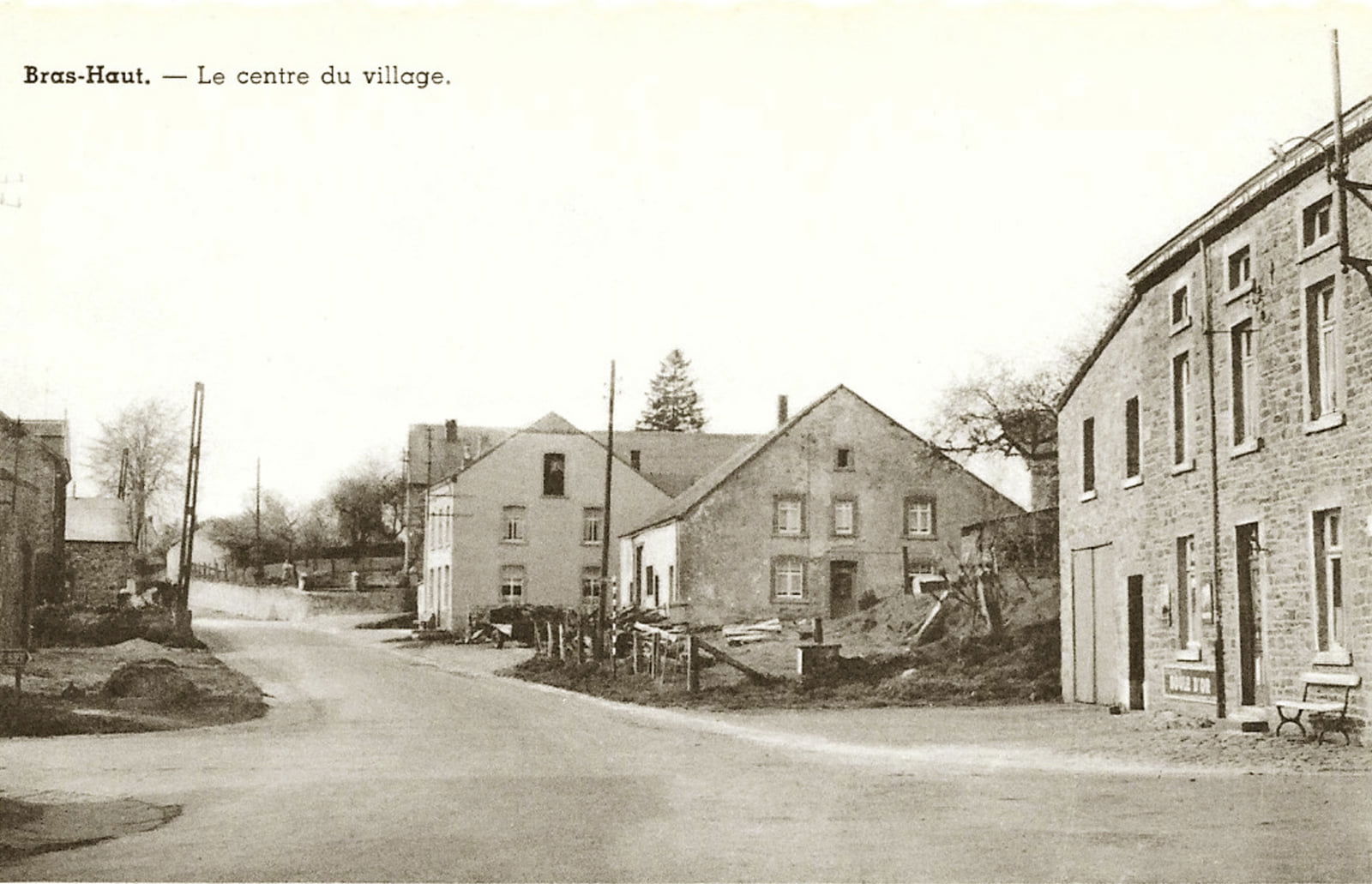 Belle vue de Bras. A l'avant plan ,le traineau qui servait a déblayer la neige. Il était tracté par des chevaux. Le traineau s'appelait la sorcière! Durant des années il y en avait un à l'entrée de Poix St Hubert en venant de St Hub et non utilisé puis il a disparu. On savait refermer le V lors d'un rare croisement avec un véhicule ou route plus étroite