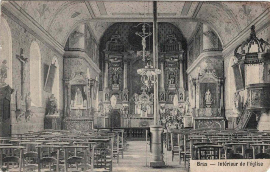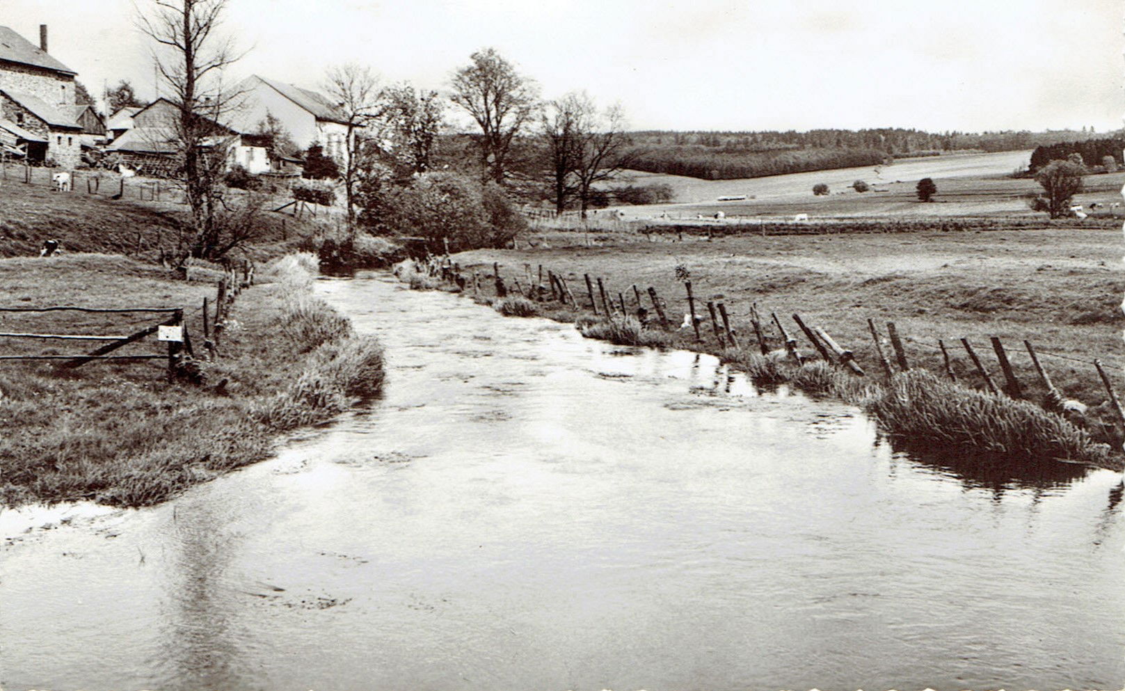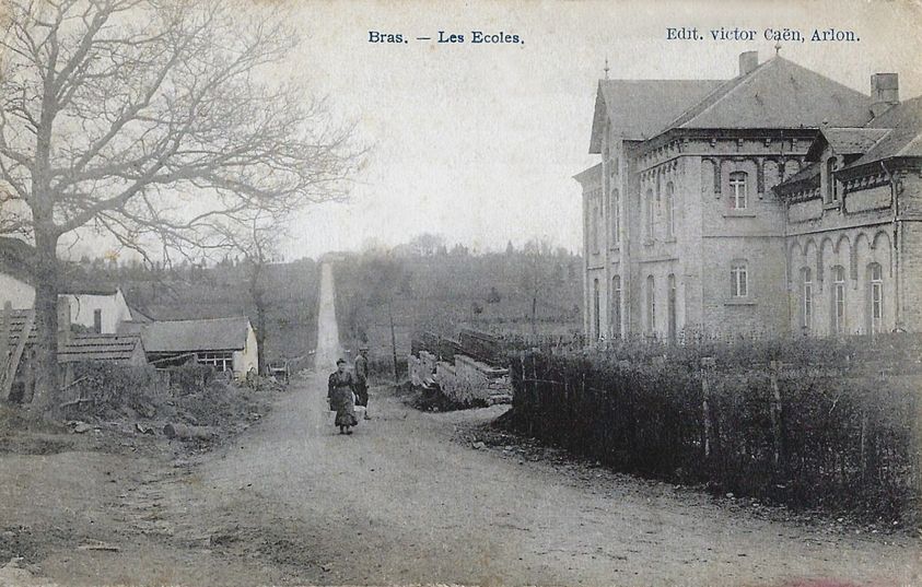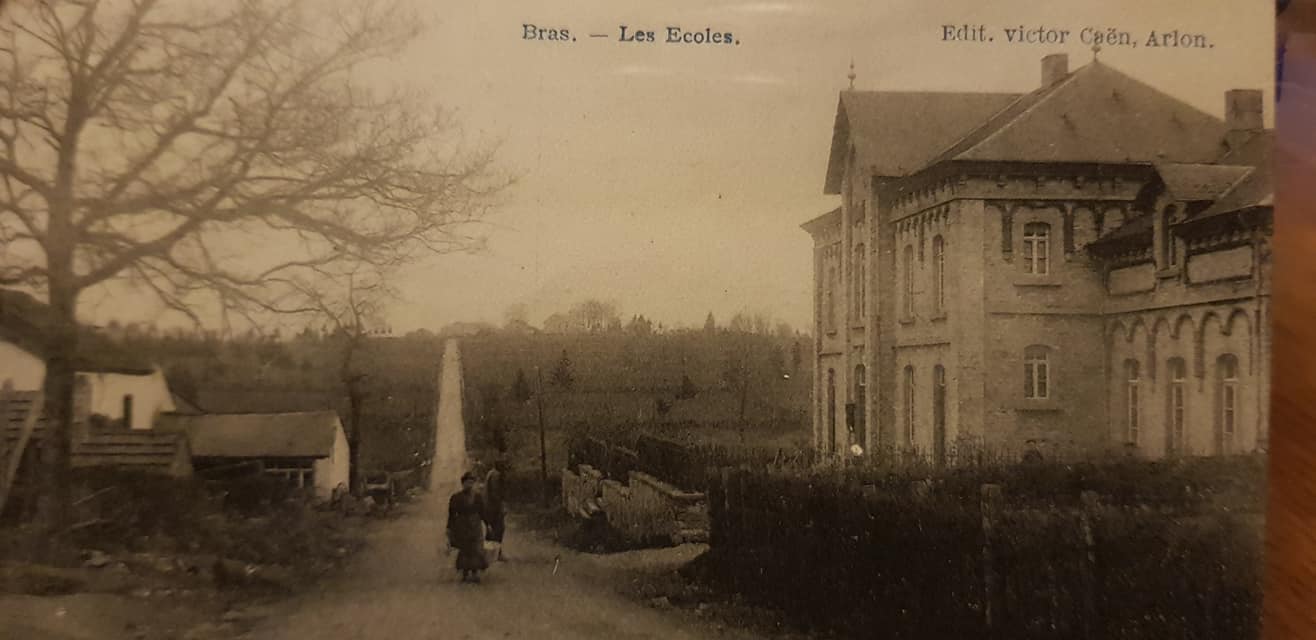 Belle vue de Bras. A l'avant plan ,le traineau qui servait a déblayer la neige. Il était tracté par des chevaux. Le traineau s'appelait la sorcière! Durant des années il y en avait un à l'entrée de Poix St Hubert en venant de St Hub et non utilisé puis il a disparu. On savait refermer le V lors d'un rare croisement avec un véhicule ou route plus étroite